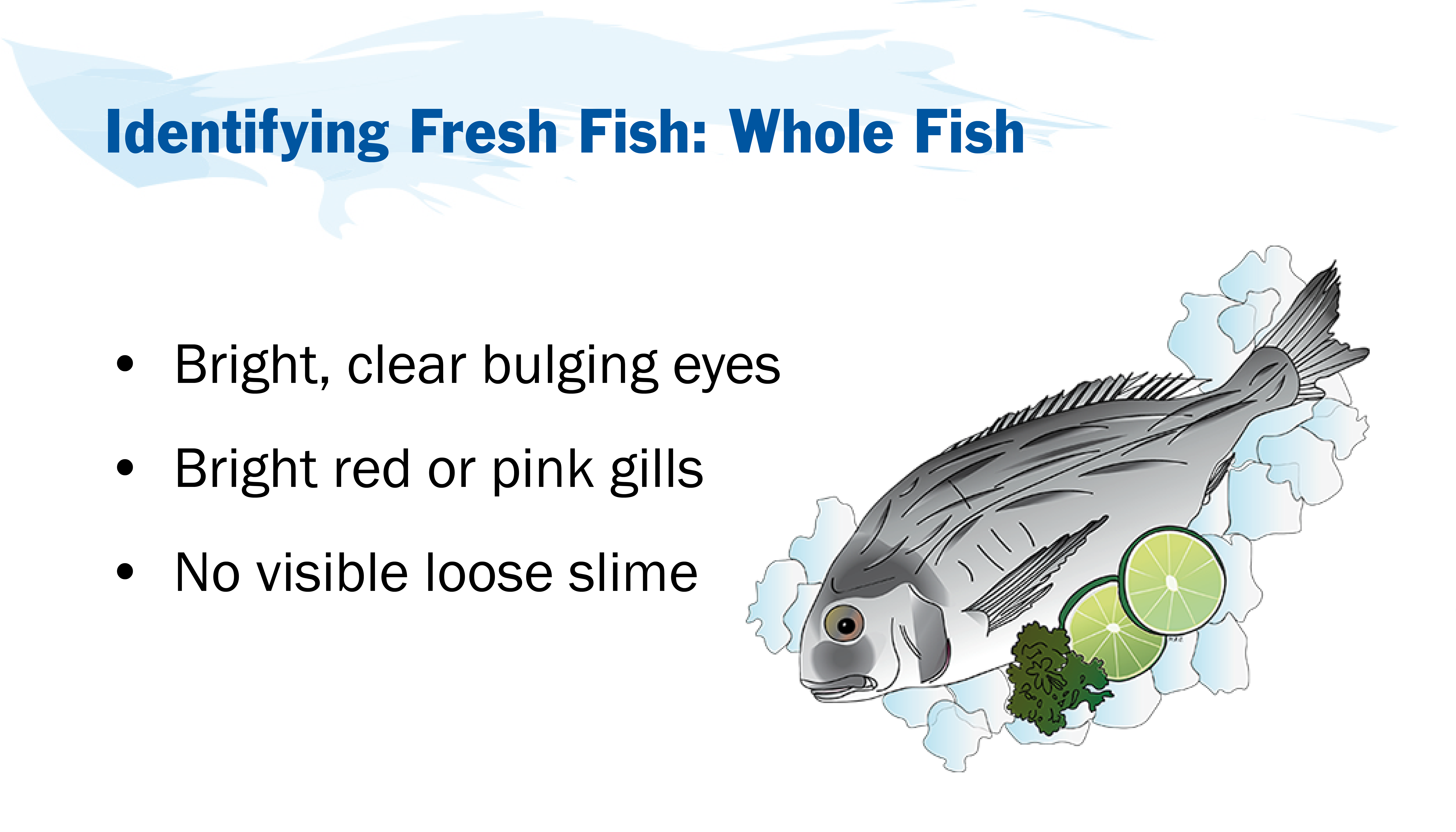 Sections on this page: Set 1: Identifying Fresh Seafood | Set 2: Handling Seafood | Set 3: Preparing Seafood
