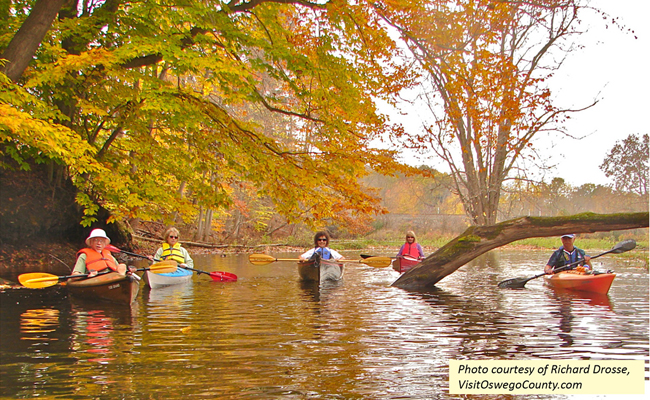As these kayakers show, it's just as important to wear you life vest during your time on the water this fall. Credit: Richard Drosse and VisitOswegoCounty.com