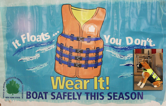 New York State law requires that everyone in a recreational vessel of 21 feet or less must wear a US Coast Guard-approved personal flotation device, or PFD, from November 1 to May 1. A PFD should be in good condition and appropriately sized for snug fit, particularly check that for children their head will not slip through; bright color and attached whistle are recommended.