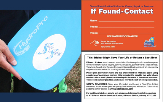 An "If Found: Contact" sticker may be attached to your vessel. The decals can be requested by sending a self-addressed, stamped envelope to NYS Parks Marine Services Bureau, Safe ‘n Sight Stickers, Albany, NY 12238. A street address is not required.