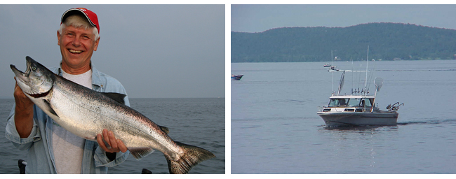 Extension of Cornell University fisheries research funded by New York Sea Grant will bring new insight on king salmon behavior to the charter fishing industry and recreational anglers. Credit: Wayne County Tourism