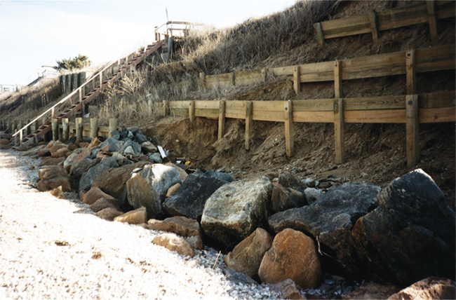 Top photo: This bluff is eroding; the face is unvegetated and slumping. As a result, the houses on top are in danger of sliding off unless immediate action is taken. Bottom photo: This bluff is stabilized by terracing the slope and installing a rock revetment at the toe. Credit: Jay Tanski