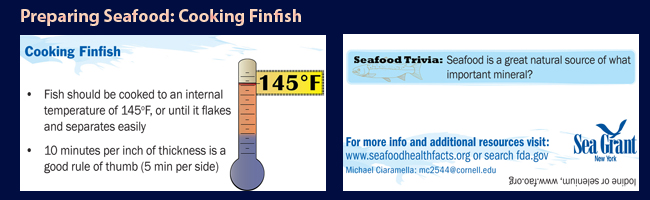 Stony Brook, NY, April 12, 2018 – Michael Ciaramella, New York Sea Grant (NYSG)’s Seafood Specialist, has developed a series of seafood information cards designed to educate consumers on selecting, handling and preparing seafood appropriately and safely. The card series encompasses seafood consumption from dock to dish and is designed to be distributed anywhere fish are sold in New York.
