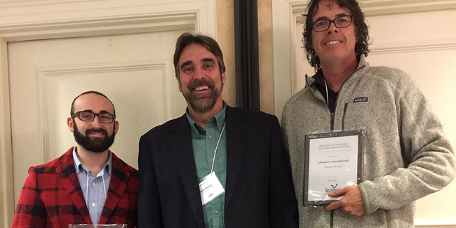 Michael Ciaramella (pictured at far left) has earned the Mid-Atlantic Sea Grant Network’s Early Career Achievement Award. Ciaramella (and Delaware Sea Grant's Edward A. Lewandowski, at far right) received the honor at late March 2018's Mid-Atlantic Sea Grant regional meeting, held in Corolla, North Carolina. They are joined here by New Jersey Sea Grant Associate Director for Sea Grant Administration / Director of Research & Extension Pete Rowe.