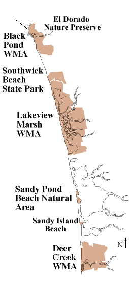 To improve our understanding of how the beaches and dunes along Lake Ontario's eastern shore are faring over time, the Central & Western New York Chapter of The Nature Conservancy, in cooperation with NY Sea Grant, NYS OPRHP, and Oswego County Soil & Water Conservation District, has developed and implemented a photo monitoring program to track changes at four sites: El Dorado/Black Pond Wildlife Management Area, Sandy Pond Beach, Sandy Island Beach and Southwick Beach State Park. Photopoints have been selected and photos are being taken in the same locations at specified intervals (usually 2-3 years).To view photopoints within each of these four sites, click on the site map to the left or on the tabs at the top of this page. This project was supported by a grant from the Environmental Protection Agency. |