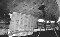 Chemical paint stripper and covering cloth applied to boat hull